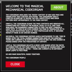 Verfasst von Medienkanzler25. Februar 201031. August 2011 Listen to the Web! Die Code Organ wandelt den Code von Websites in Musik um. Schrill. Gefunden bei Wir sind das Internet medienkanzler.net by Daniel Fitzke Auf X teilen (Wird in neuem Fenster geöffnet) X Auf Pinterest teilen (Wird in neuem Fenster geöffnet) Pinterest Auf Facebook teilen (Wird in neuem Fenster geöffnet) Facebook Auf WhatsApp teilen (Wird in neuem Fenster geöffnet) WhatsApp Einen Link per E-Mail an einen Freund senden (Wird in neuem Fenster geöffnet) E-Mail Drucken (Wird in neuem Fenster geöffnet) Drucken Gefällt mir Wird geladen … Ähnliche Beiträge Hinterlasse einen Kommentar Antwort abbrechen Δ