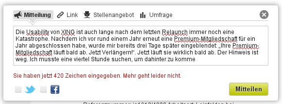 Das wollte ich Euch sagen: „Die Usability von XING ist auch lange nach dem letzten Relaunch immer noch eine Katastrophe. Nachdem ich vor rund einem Jahr erneut eine Premium-Mitgliedschaft für ein Jahr abgeschlossen habe, wurde mir bereits drei Tage später eingeblendet: „Ihre Premium-Mitgliedschaft läuft bald ab. Jetzt Verlängern!“. Jetzt läuft sie wirklich bald ab. Der Hinweis ist weg. Ich musste eine viertel Stunde suchen, um dahinter zu kommen, wann sie genau endet. Sicher wird sie jetzt am Freitag automatisch verlängert. Einen „Kündigen“-Link konnte ich nirgends finden. Ich bin richtig sauer. Börsennotierten Unternehmen kann man scheinbar als Kunde grundsätzlich nicht trauen, Und wenn die automatische Verlängerung kommt, weiß ich, was als nächstes in meinem Blog steht…“