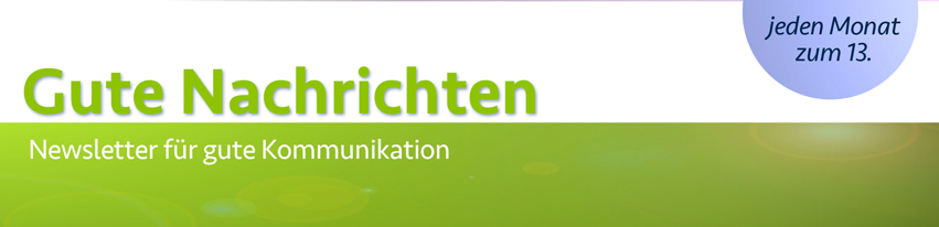 am Samstag, 13. Januar 2018, erscheint die erste Ausgabe von „Gute Nachrichten“, dem Newsletter für gute Kommunikation. Jeden Monat zum Dreizehnten gibt es eine neue Ausgabe – natürlich ganz unverbindlich und kostenlos.